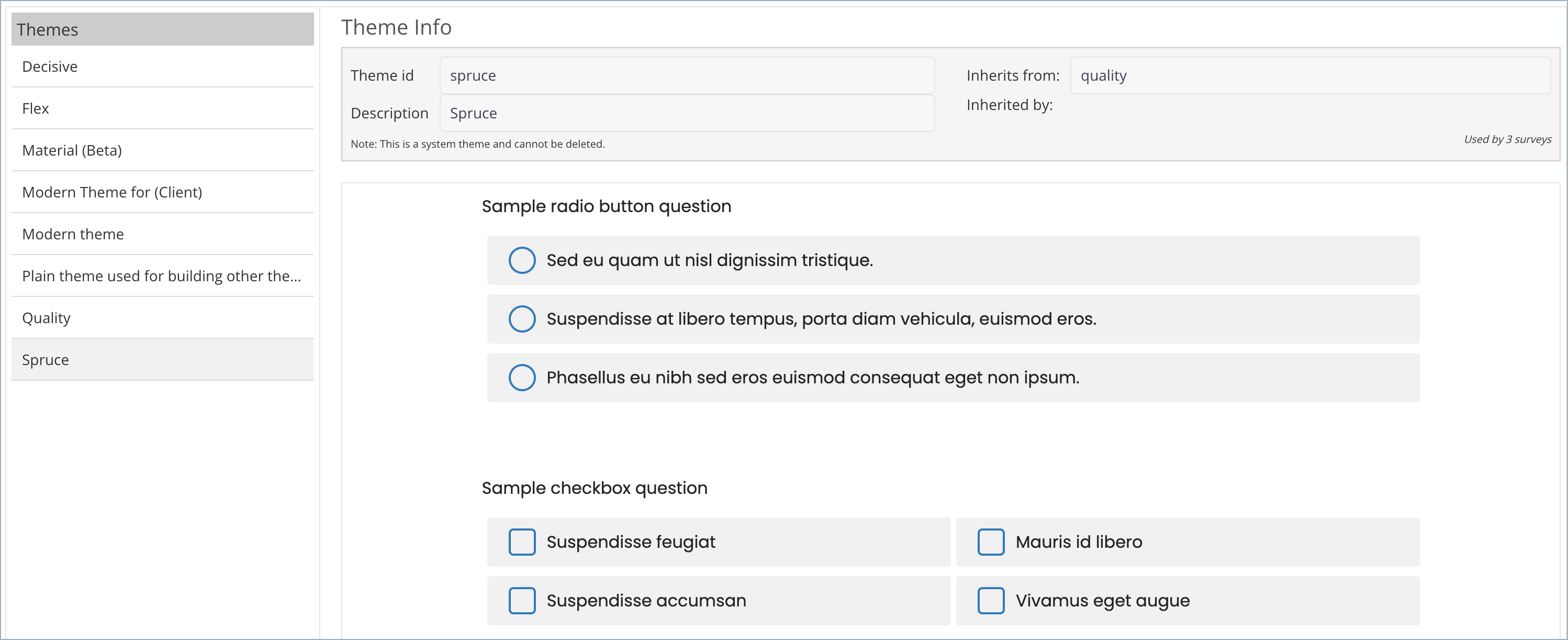 Themes define the visual look and feel of a survey. The Themes applet allows users to view a list of all available themes and preview each one.
